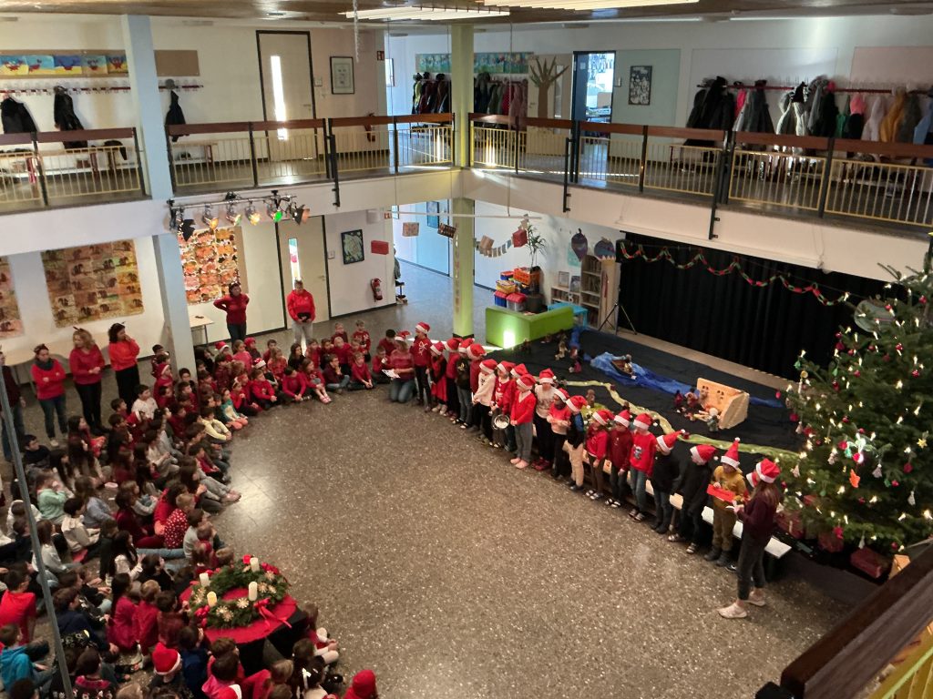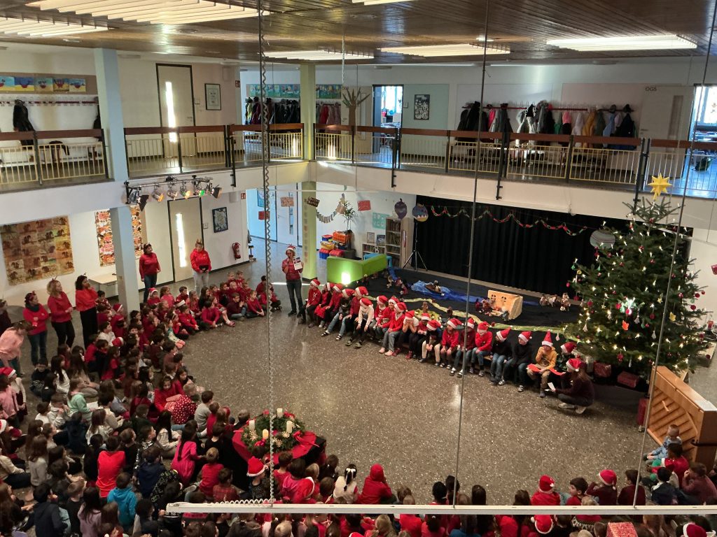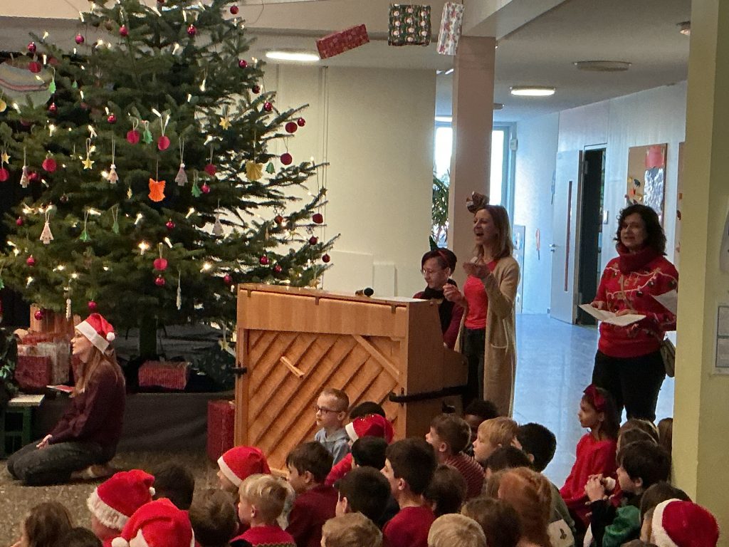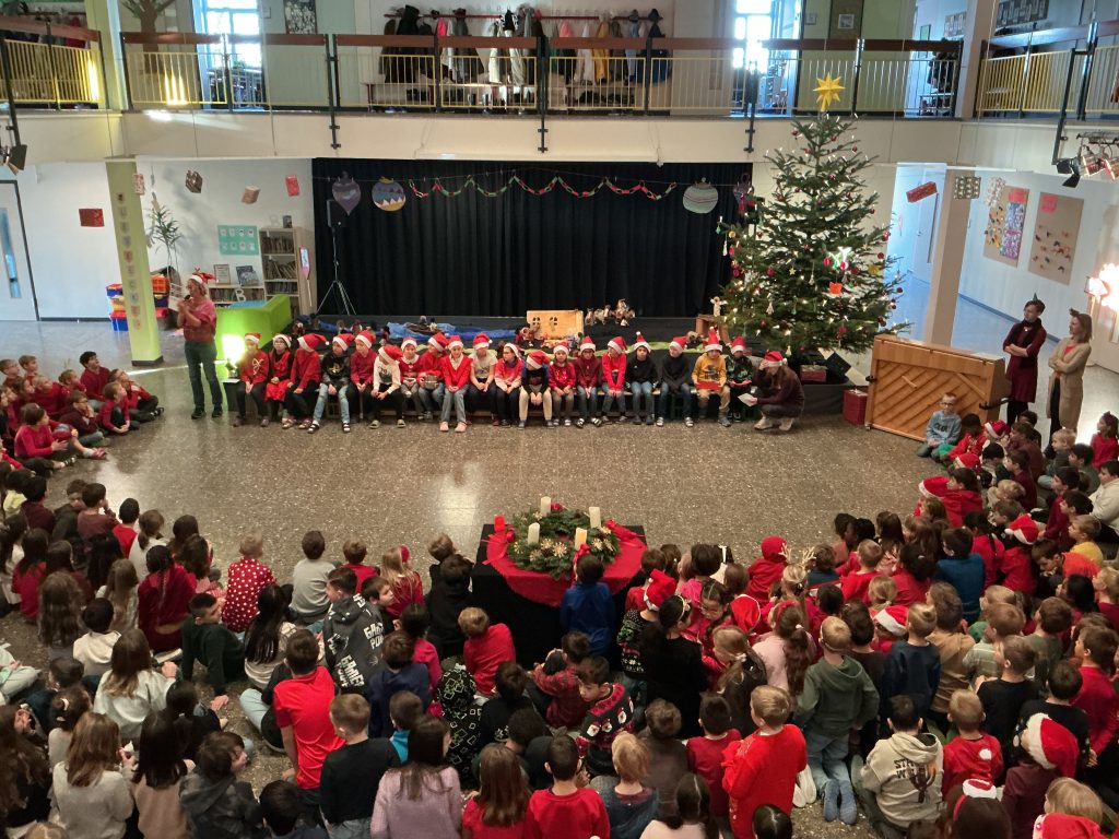 Mit dem Beginn der Adventszeit verwandelt sich unsere Aula jeden Montag traditionell in einen stimmungsvollen Ort, der SchülerInnen, Lehrkräfte und Beschäftigte gleichermaßen zusammenbringt. Der festlich geschmückte Adventskranz, die liebevoll dekorierte Bühne und der große Tannenbaum sorgen auch in diesem Jahr für eine besonders herzliche Atmosphäre. Groß und Klein lauschen gespannt den Weihnachtsgeschichten der 3.Klassen, die sich sehr viel Mühe geben und voller Stolz ihre Ideen präsentieren. Unter der Leitung von Frau Kaiser und der musikalischen Begleitung von Frau Günter erklingen die allseits beliebten Weihnachtslieder und machen so richtig Lust auf die schönste Zeit des Jahres.