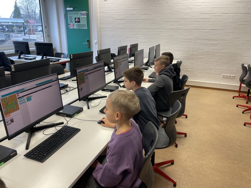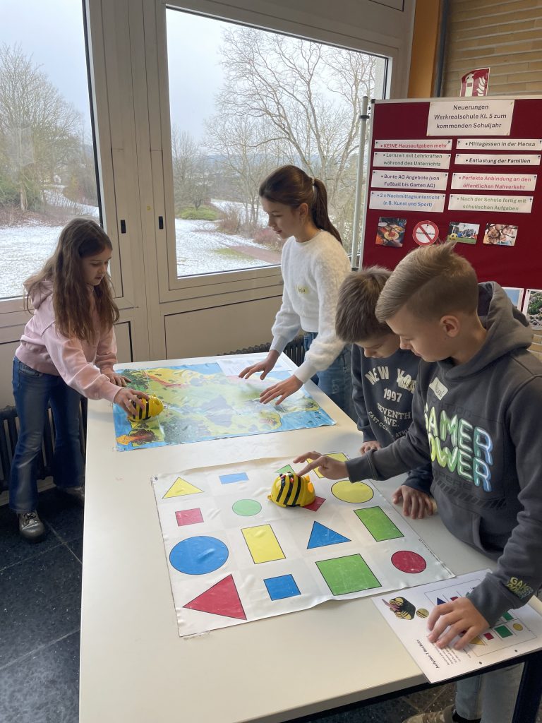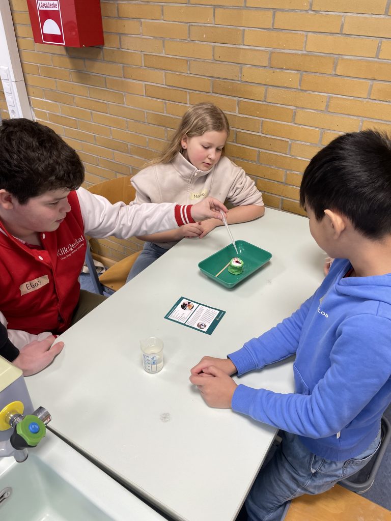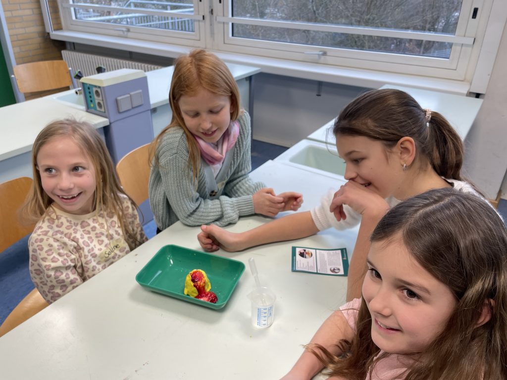 Die Klassen 4a, 4b und 4c besuchten jeweils zwei verschiedene Angebote aus den Bereichen Informatik, Küche und Chemie. Im Fach Informatik programmierten die Kinder Bee-Bots, ließen Drohnen durch einen Parcours fliegen und bauten eigene Konstruktionen. In Chemie führten sie mit großer Begeisterung Experimente durch, während in der Küche mit viel Freude leckere Cookies gebacken wurden.